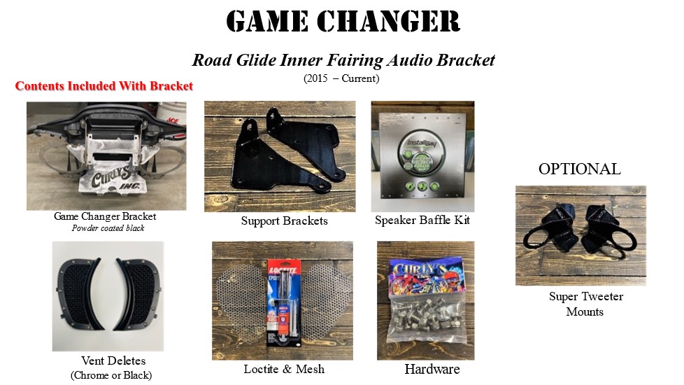 Contents Included in Kit: Game Changer Bracket – Support Brackets – Speaker Baffle Kit – Vent Deletes – Loctite & Mesh – Hardware – Installation Instructions